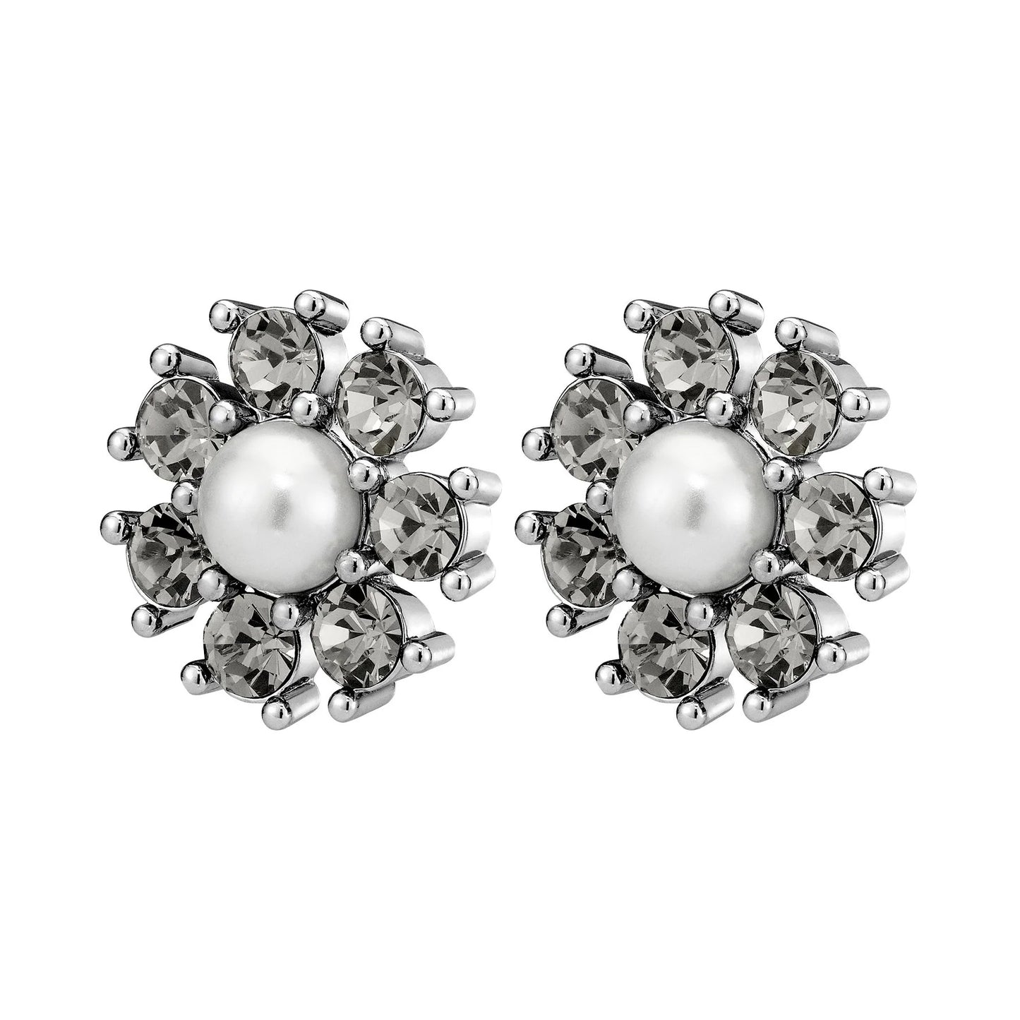 Introducing Aude stud earrings, a perfect blend of elegance and sophistication. These stunning earrings feature a large solitaire centre crystal, flanked by seven smaller prong-set crystals, all meticulously set by hand. Shown here in a radiant silver-tone with a combination of grey and white pearl crystals, Aude earrings are designed to dazzle.