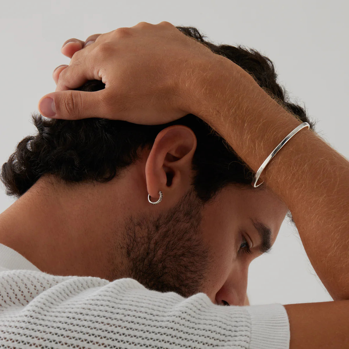 The two complementary surfaces of the Dualis Men’s Earring represent balance and stability. Its refined yet rugged design is meticulously hand-forged using sterling silver. One side is smooth, and the other is ridged, offering reversibility to match style and mood.