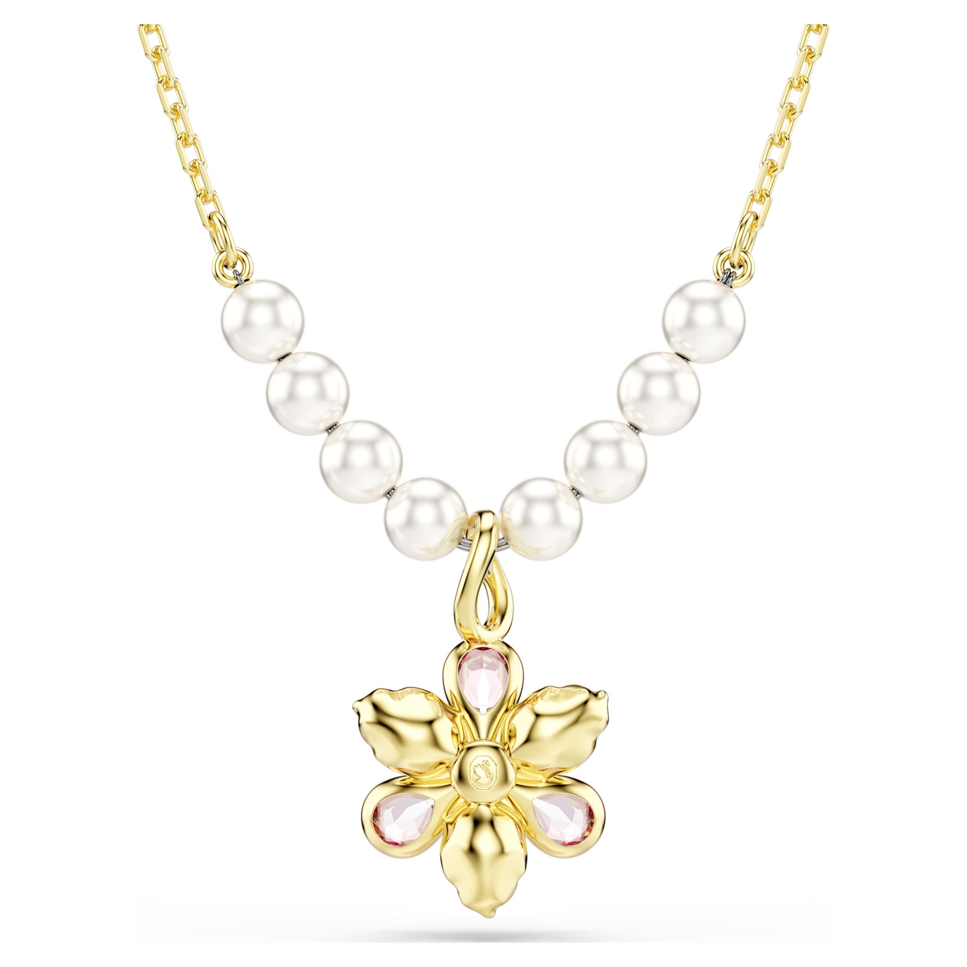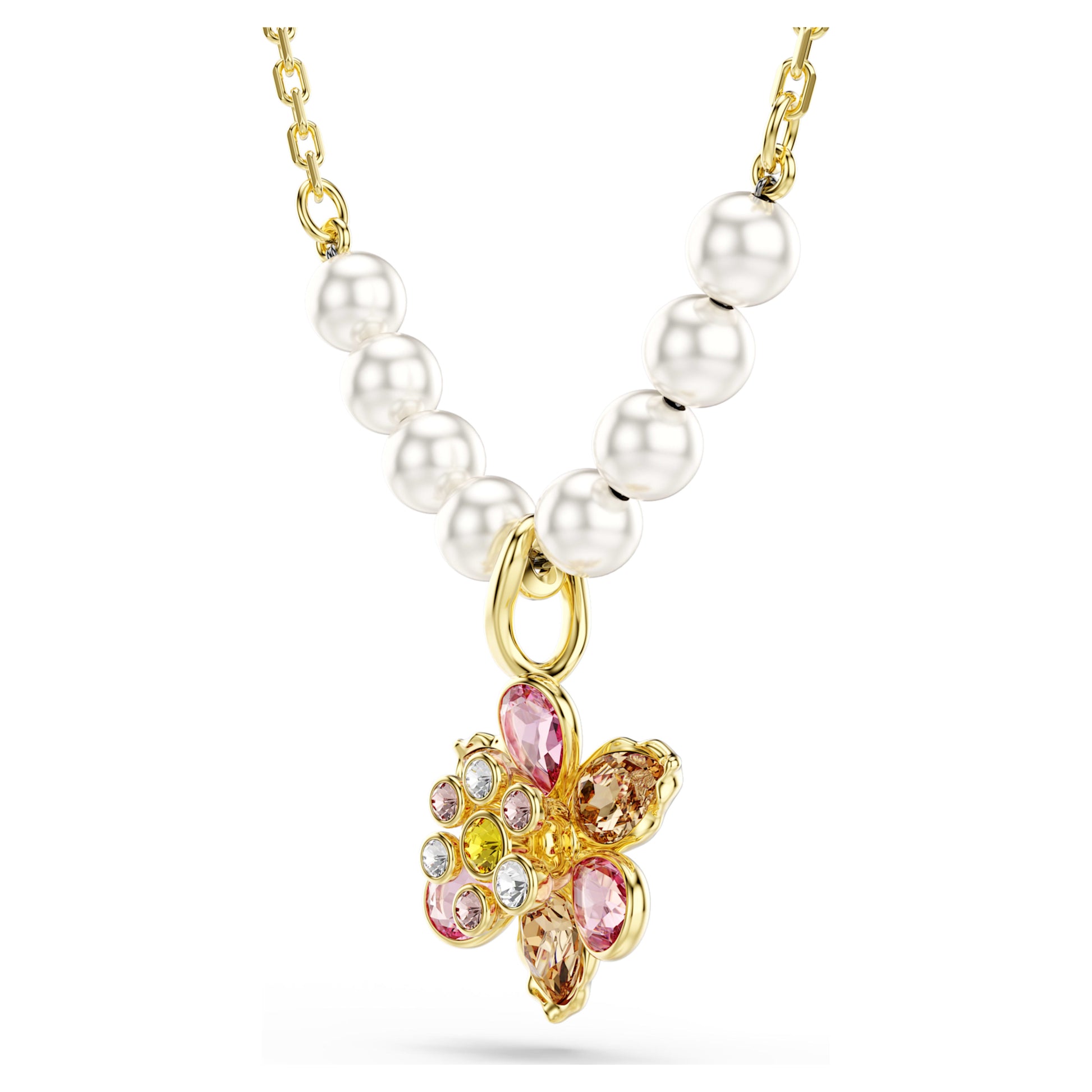 This charming pendant adds a magical and nature-filled touch to any outfit. The gold-tone plated chain features eight Swarovski Crystal Pearls, elegantly set on either side of a single flower, which has been expertly crafted from crystals in various cuts and soft colours. The jewellery includes a lobster closure and an elongation for an adjustable fit. A wonderful gift of luxury for effortless everyday wear.