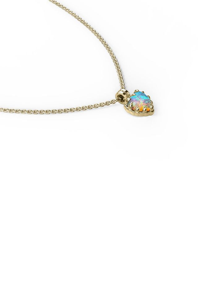 The signature Love Claw Necklace by SGC features a heart-shaped faceted Bello Opal suspended in their claw setting. Crafted in sterling silver with 18k gold plating this sleek pendant hangs from a diamond cut cable chain, catching light to reveal flashes of orange, pink, and purple.