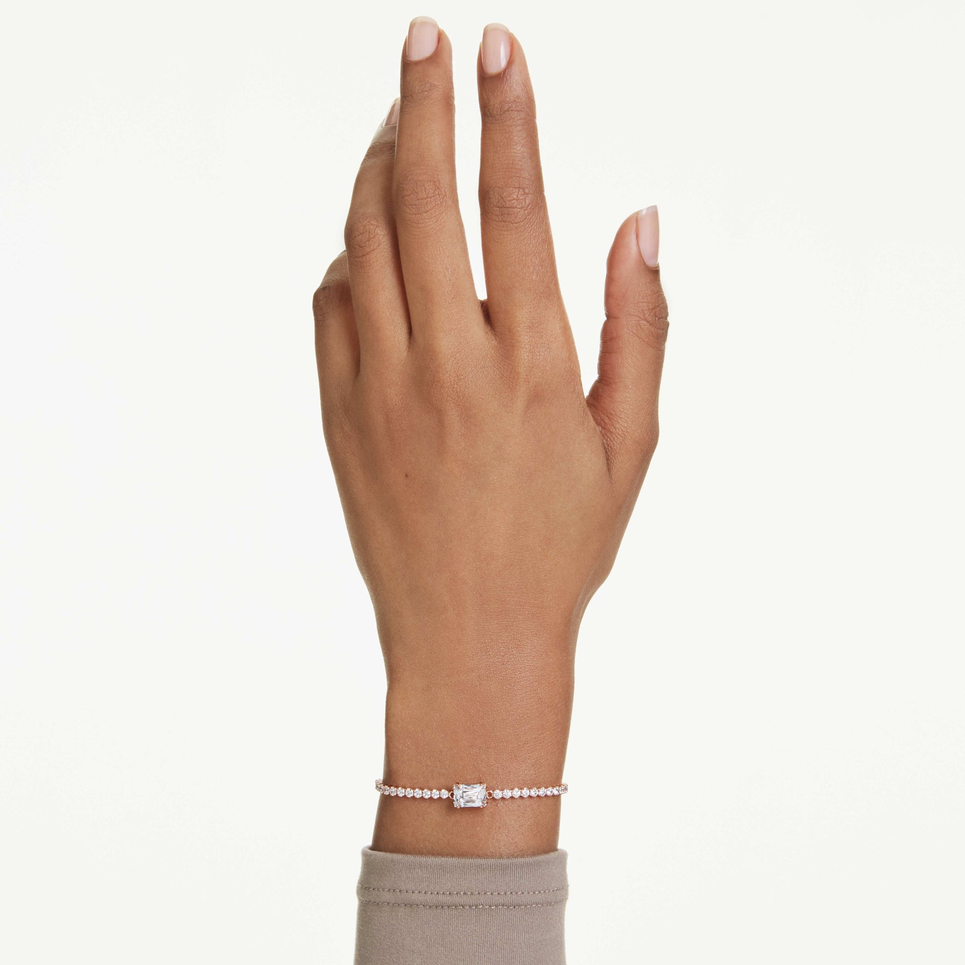 This classic Tennis bracelet adds a touch of radiance to any look. Fastened with a sliding closure for an adjustable fit, the rose gold-tone plated design features a uniform row of Swarovski Zirconia and is accented with a baguette-cut Swarovski Zirconia at its centre. A vibrant twist on a timeless style that you can wear time and time again.