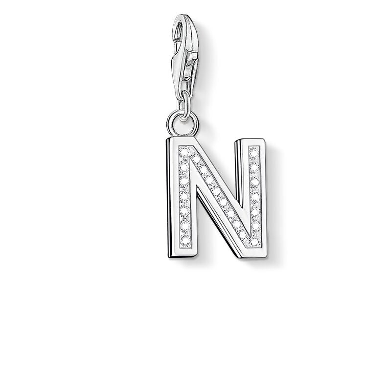 Initial "N" charm in 925 Sterling silver with Cubic Zirconia.