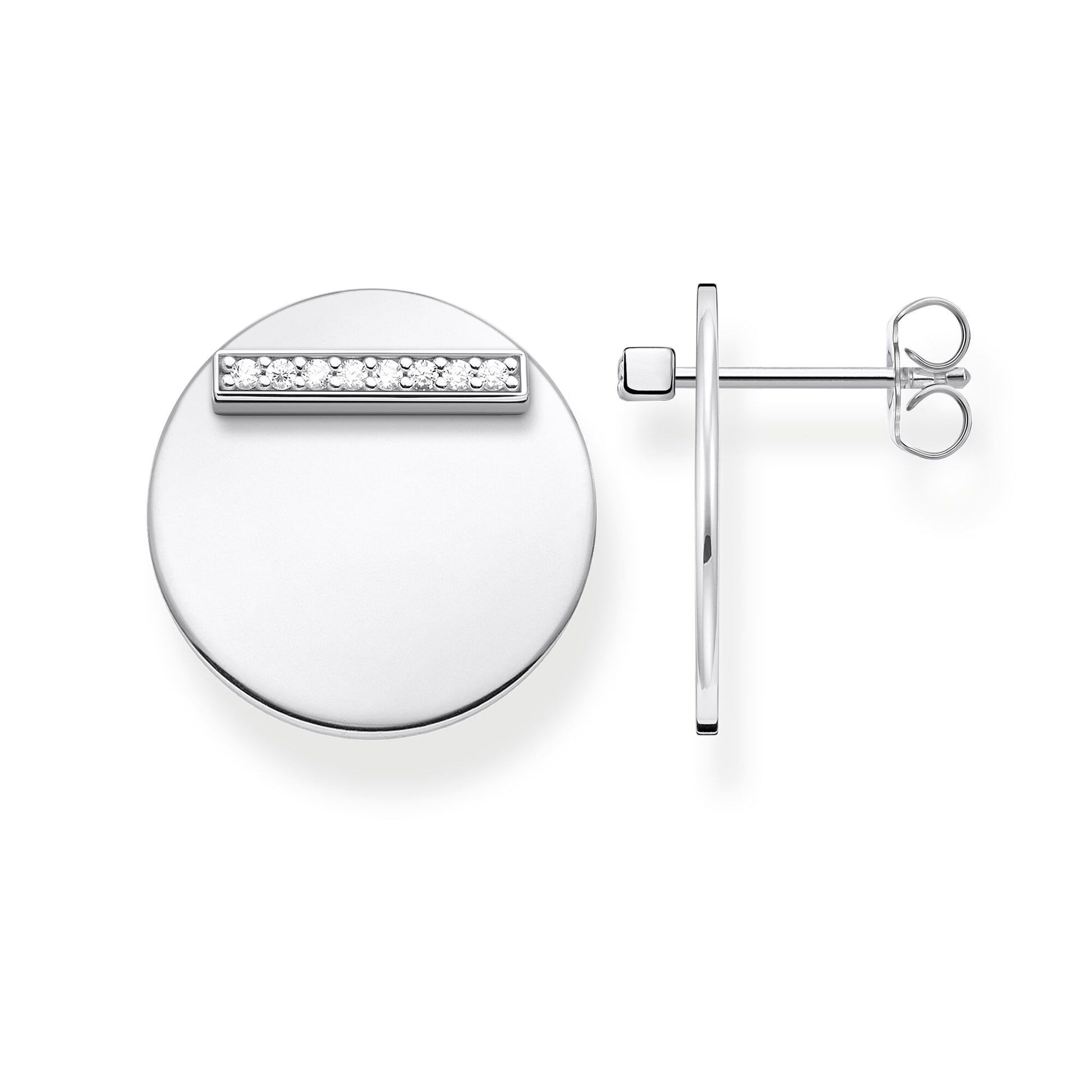 One ear stud, two ways to wear it. Behind the zirconia-encrusted bar adorned with eight sparkling stones, shines a round, polished disc. The two design elements are not permanently connected to each other. This means that the ear studs can be worn in different variations: with and without the zirconia bar element.