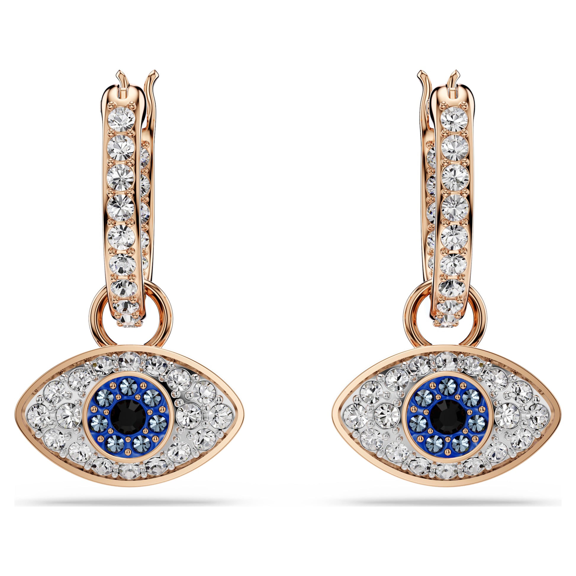 Tune into your spiritual side with these rose gold-tone plated earrings. Suspended from classic pavé hoops, the domed evil eye motifs are adorned with clear, blue and black pavé. A play on the traditional talisman symbol, these earrings will infuse any outfit with a touch of mystical glamour.